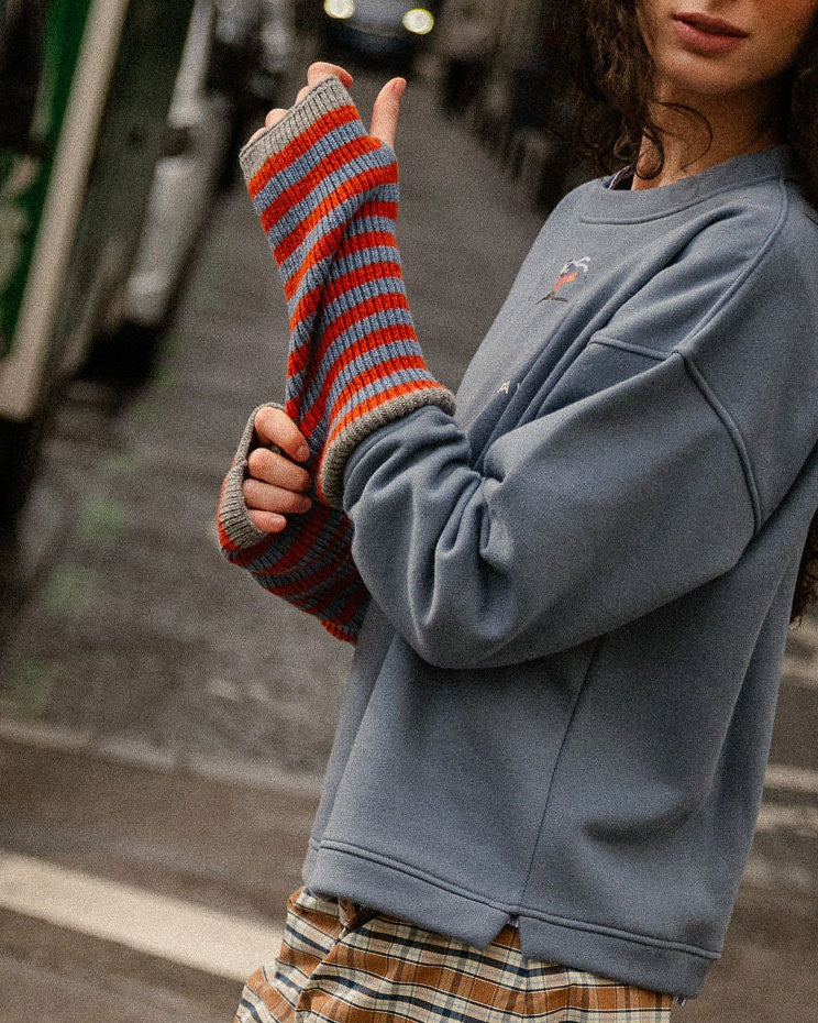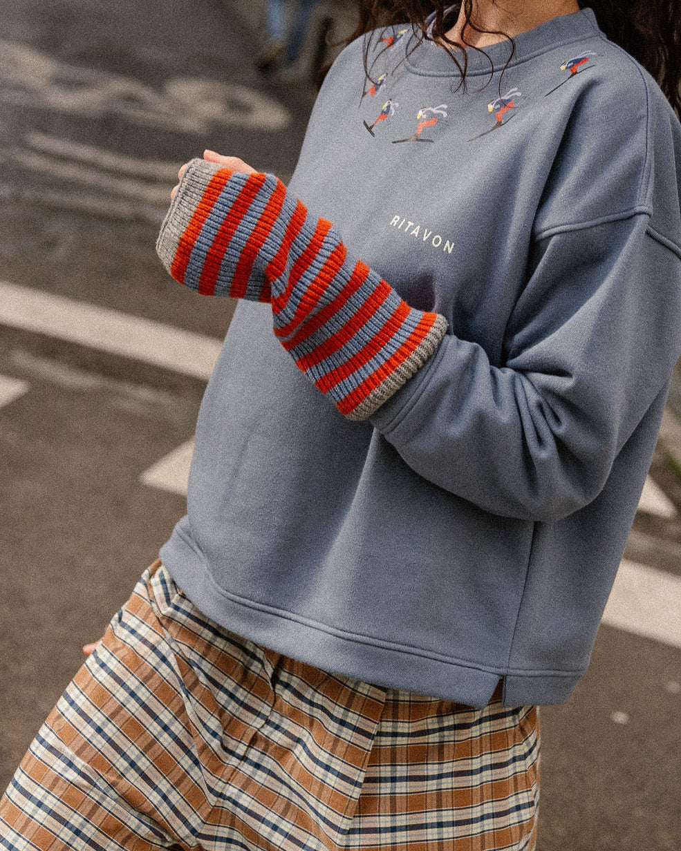 Nos moufles sont idéales... Rayures orange et bleues avec une bordure gris foncé.